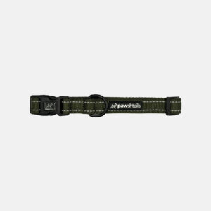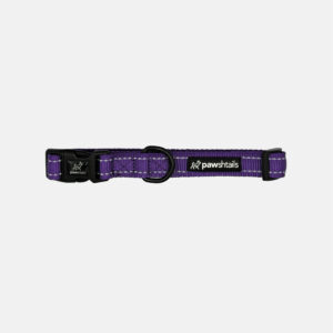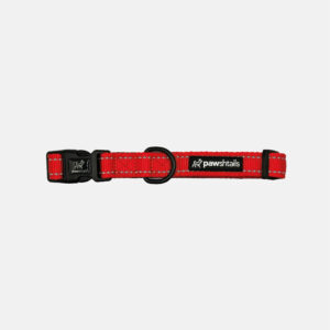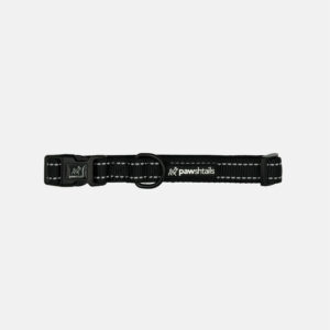 The Pawshtails Everyday Collar is a durable dog collar made from soft neoprene, reinforced with nylon webbing for extra strength, reflective safety trim, an easy quick-release buckle and a solid ring for the leash attachment.